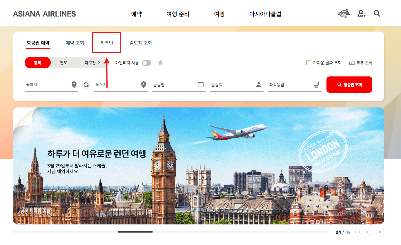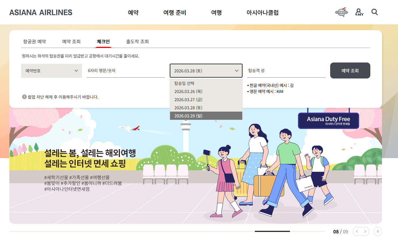 아시아나 항공 체크인 및 좌석지정에 대해 안내드립니다.