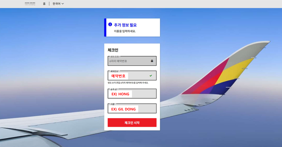 3. 화면이 하단 사진처럼 표기됩니다. 고객님의 영문이름을 성 -> 이름순 정보 입력 후 "체크인 시작" 버튼을 눌러주세요.