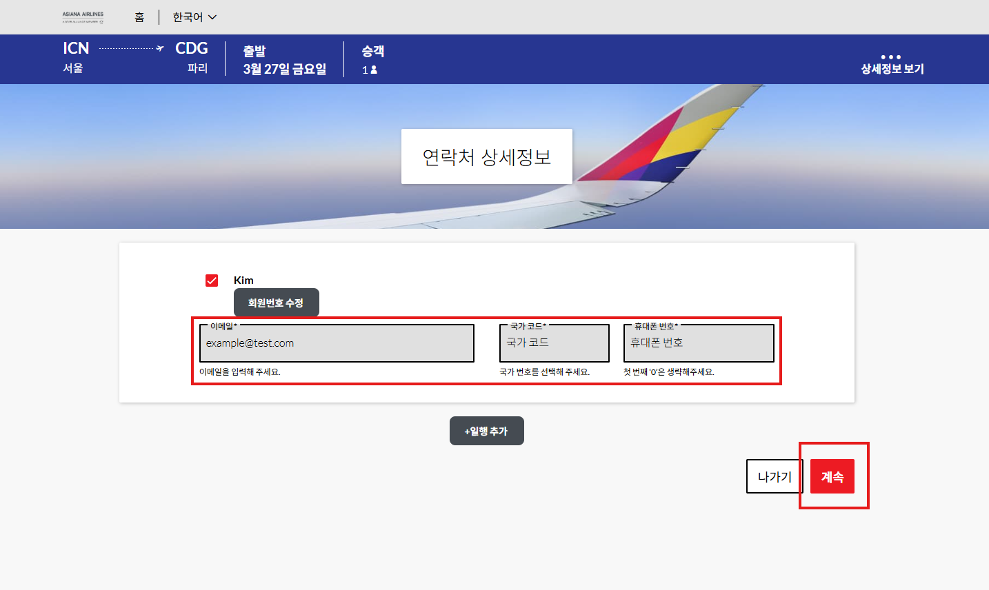 5. 승객 체크 후, 이메일, 국가코드, 핸드폰 번호 입력 후 "계속"을 눌러주세요.
