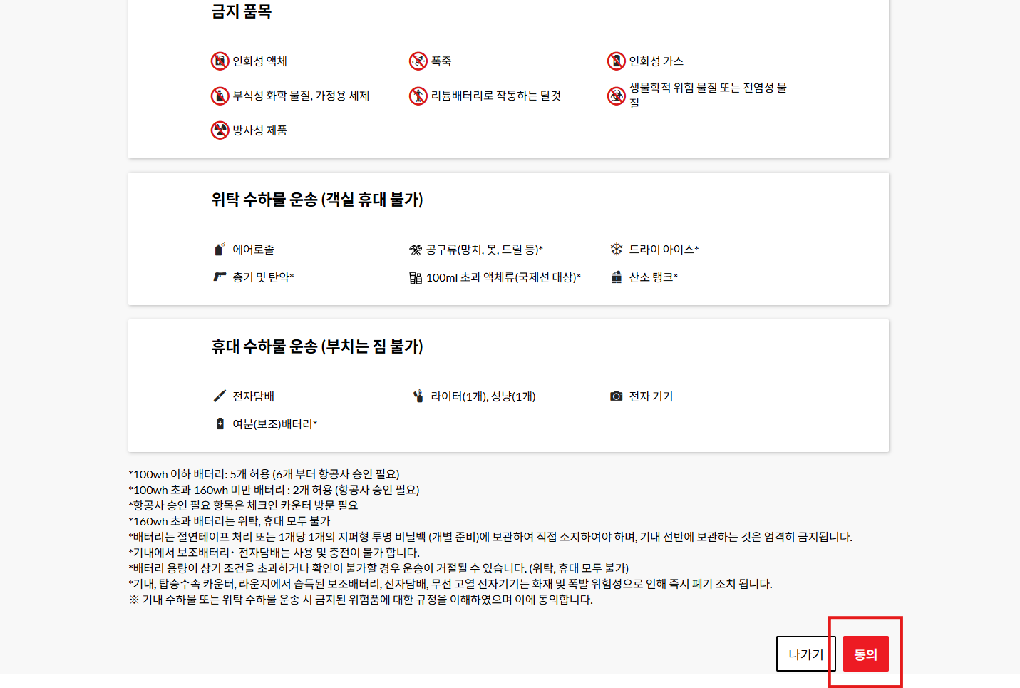 6. 다음과 같은 화면이 나오면, 위험물에 대한 주의사항에 대한 내용 확인 후 "동의"을 눌러주세요.
