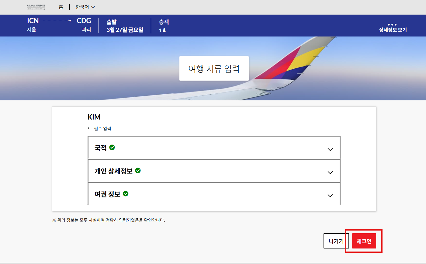 7. 고객님의 여권 정보가 정확한지 확인 후 "체크인" 버튼을 눌러주세요.